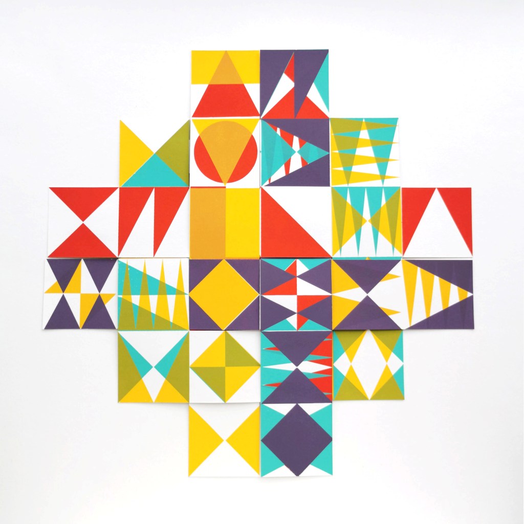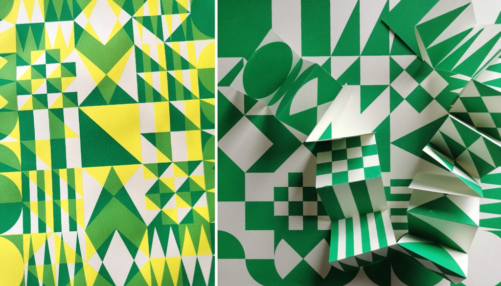 These new artworks utilise my screens of geometric artwork practically exploring research into motif distribution in printed pattern thinking formalised by Lewis Foreman Day in his book Pattern Design, published in 1901. Having printed the artwork in the first colour, I rotate the screen by 90-degrees and print the second colour, turning the artwork / screen up to four times for maximum complexity. To add a further dimension, I’ve been constructing works on paper that utilise several iterations of the prints to build new compositions by weaving and slotting strips of the printed papers in differing combinations of the four colours in the palette, providing the coherency across the series, and an injection of the spirit of summer fairgrounds through the colour and geometric visual language.