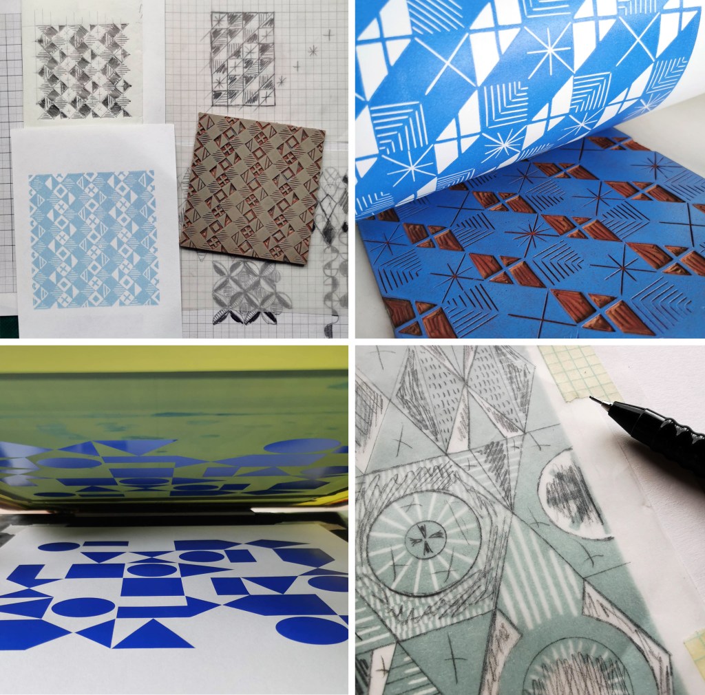 I’ve been enjoying some studio time to explore my print research as works on paper with the hope of exhibiting the work. I enjoy paper engineering and construction (that’ll be the book artist in me!) and have previously tested paper manipulation in relation to this current pattern research. I tend to work in this way, creating drawings or prints to exhibit / sell alongside forming pattern ideas, and it has been useful to see the evolution of the sampling in this way here too.