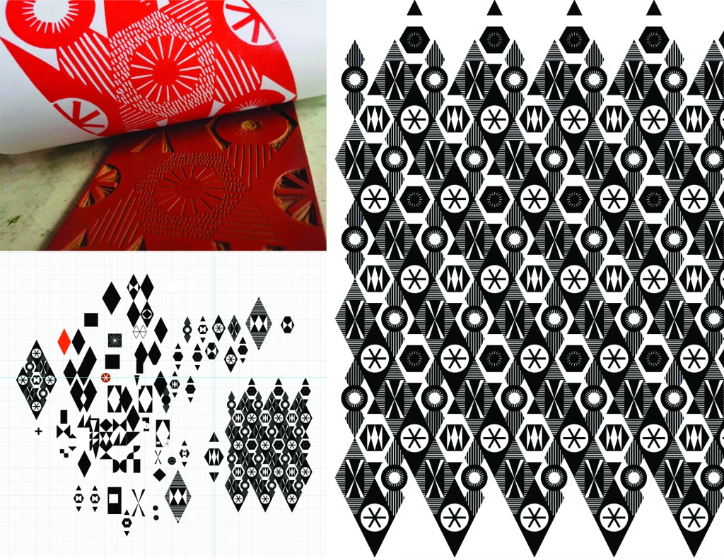 Steve worked with me to sample some of the early versions of these designs generated as digital scans from lino prints initially, but I didn’t like the visual quality in the translation of the prints. The original artworks for this collection were generated using collage and screen printing alongside the lino prints as I prefer designing with a physical relationship to image creation. After further consideration I opted to create each of the designs as vector-based files for production, providing sharp graphic quality to the patterns.