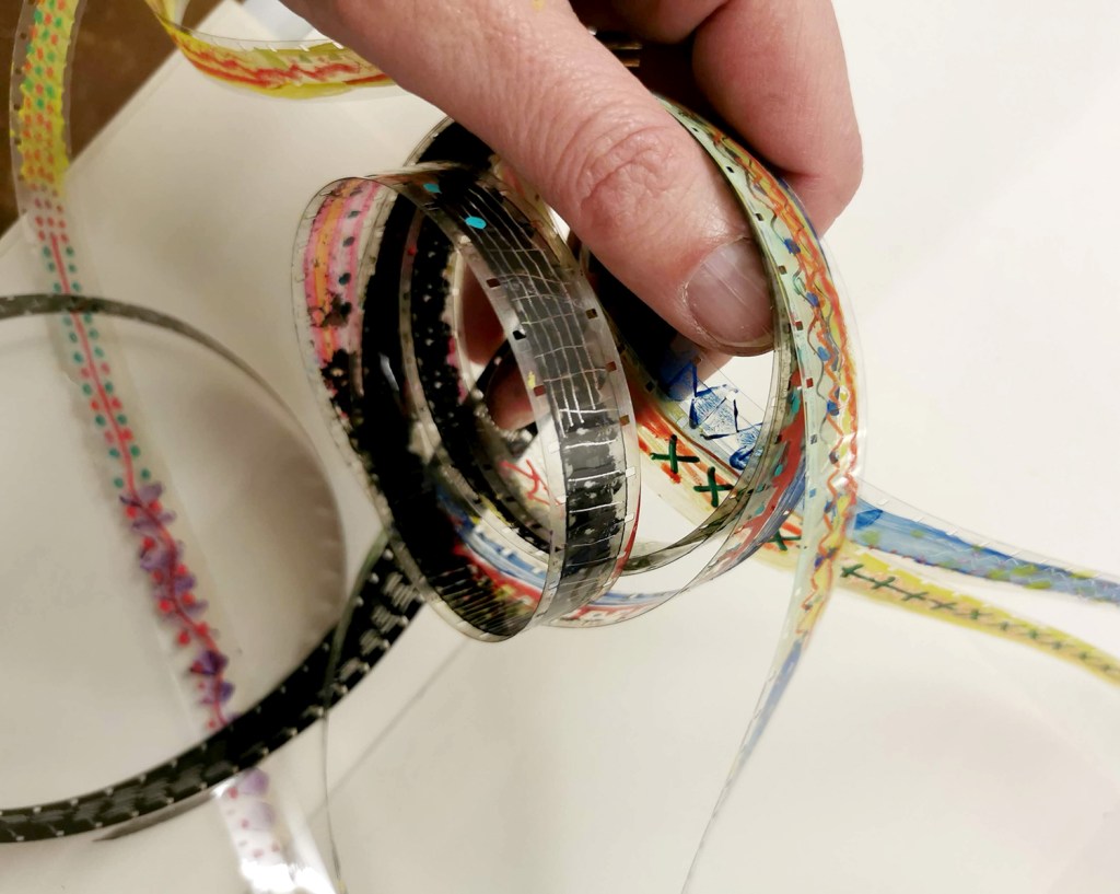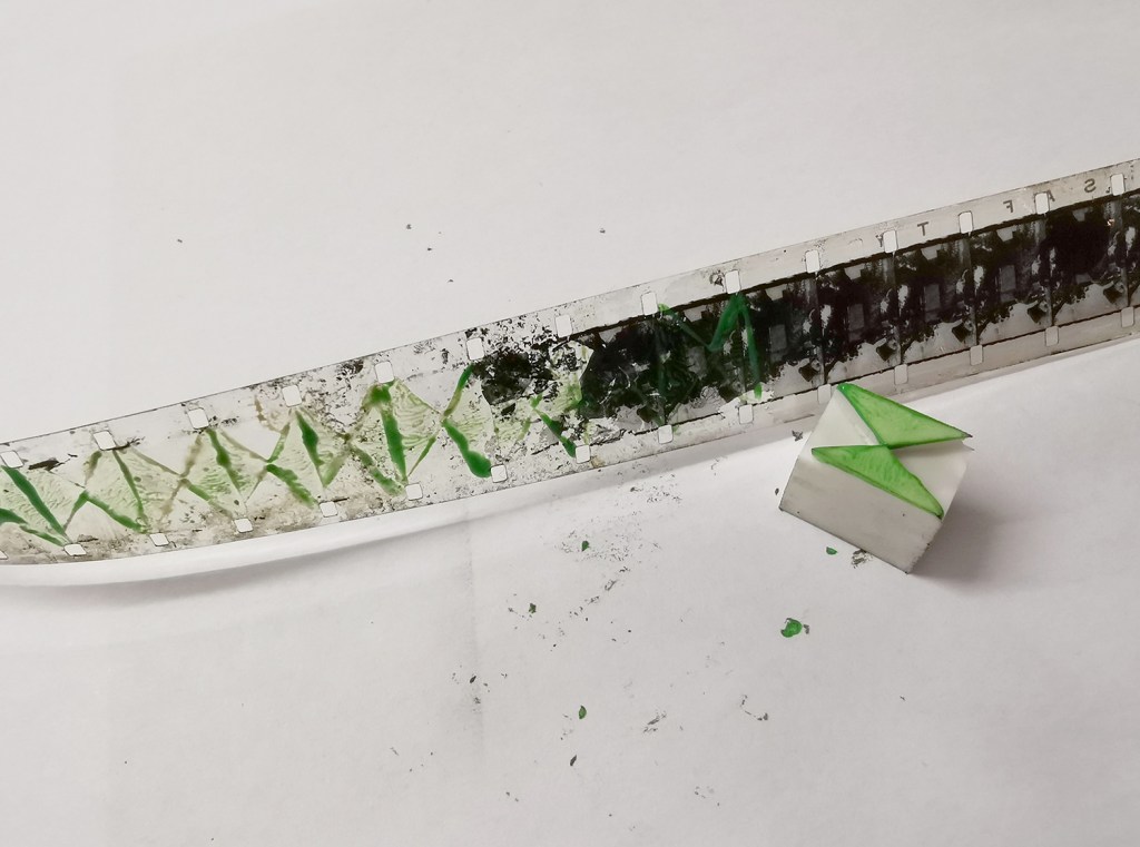 We were given strips of clear 16mm film I was able to use pens, paint, rubber stamps and Letraset on, as well as pre-exposed film with archive films that we could scratch away the black with a scalpel beautifully. I know it’s obvious to say, but 16mm is tiny, and I’d forgotten my glasses, so that added to the issue of seeing what I was working on! It’s a tiny space to include anything too complex and I was unsure initially how many times to repeat motifs and at what pace to move motifs across the film, but I just had a go and tried not to be too precious.
