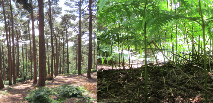 During a beautiful adventure in the Lickey Hills, south of Birmingham at the weekend I took these photos that showed how similar the environment close to the ground was to the canopy of the much taller pine trees. It highlighted to me the experience of scale and how important the context is. I tend to record this sort of detail in my garden sketches too and so it struck a chord.