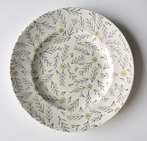 One design is pared right back to stylise the flower by only recording a stem and flower head. The style is almost diagrammatic in the simplicity of the motif consisting of black stem and V-shaped lines crossing the stem to suggest leaves. The flower head is a straightforward circle with a dotted outline. Not all stem motifs have heads, there is a randomness in the composition across the plate.