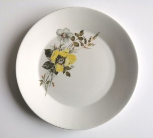 The other plate design features painterly and drawn details, a generous sprig of flowers utilising more colours to express the tones and textures of the flower and leaf details and certainly more expressive in its rendering. The flowers are placed on one side of the plate, as if allowing space for the cake to be placed alongside. The yellow flower head is certainly the attention grabber.