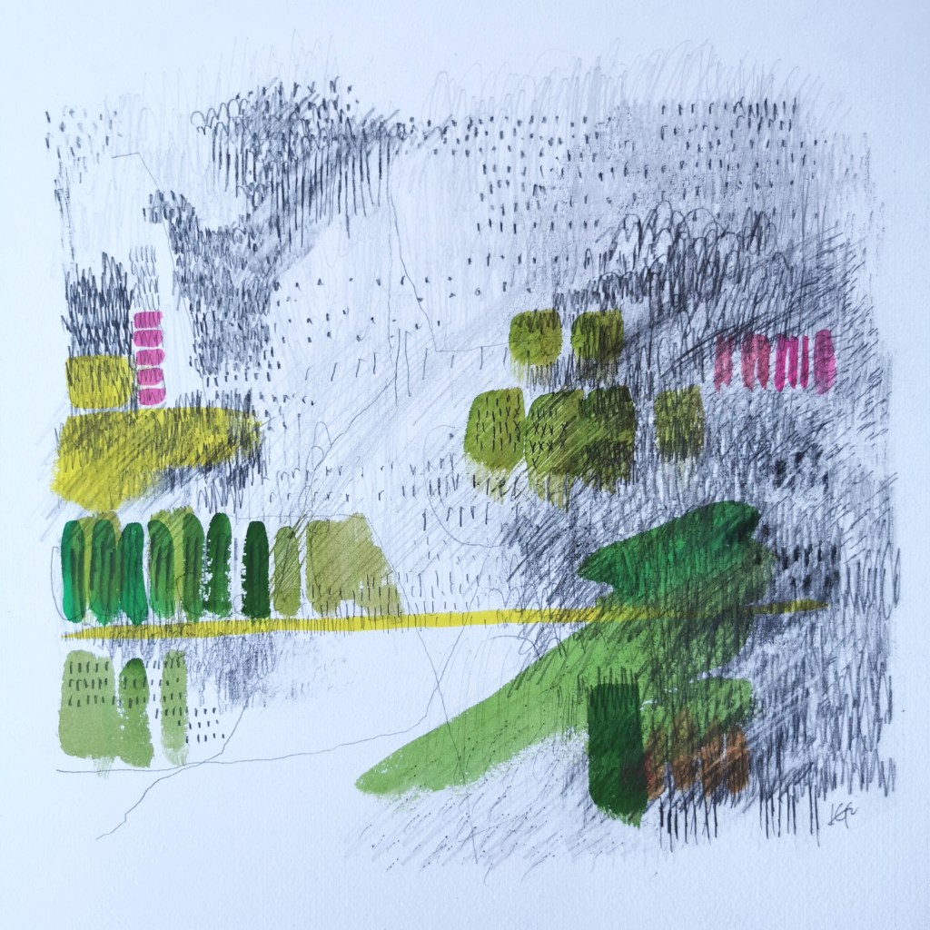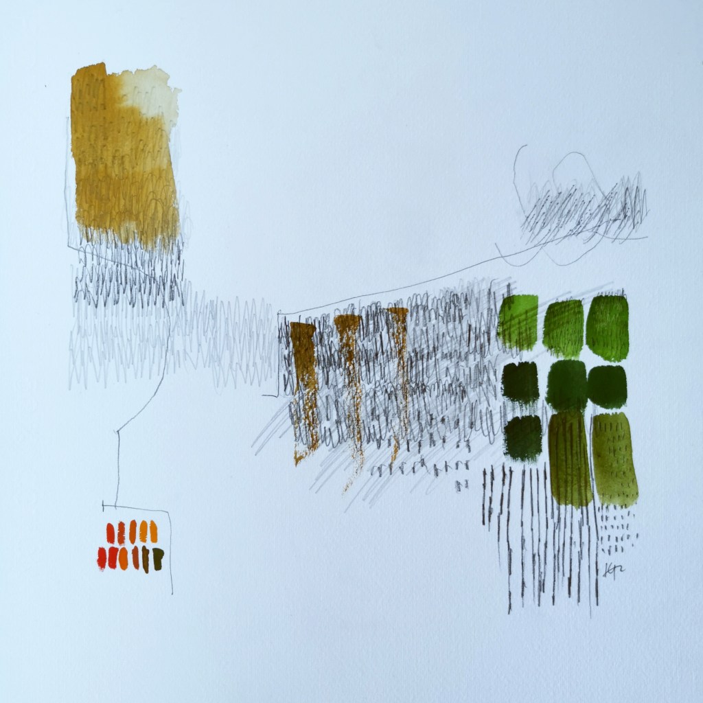 I’ve been working on some new landscape-inspired drawings, bringing together some colour mixing and the monochrome marks, rhythms and textures relating to the Norfolk landscape. I began with a journey through the drawers of my plan chest to pull together a dictionary of visual language to guide me, and following a cycle ride in the landscape I took pencil in hand, and began to draw. Painting features very little in my practice, really only for colour-mixing but this time it felt right to capture the colour in gouache and apply directly with brushes on to the paper, layered up with the graphite of the drawing.