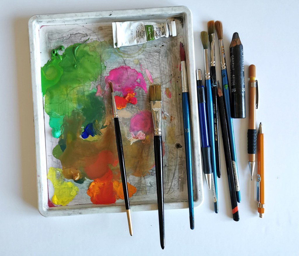 Rucksack pockets were filled with samples of treasure ready to investigate later. The process of drawing enables me to get to know an object, and by making several studies of each item I enjoy developing a stylised representation. I hope never to tire of the getting-to-know-you drawing process I have practised for thirty years.