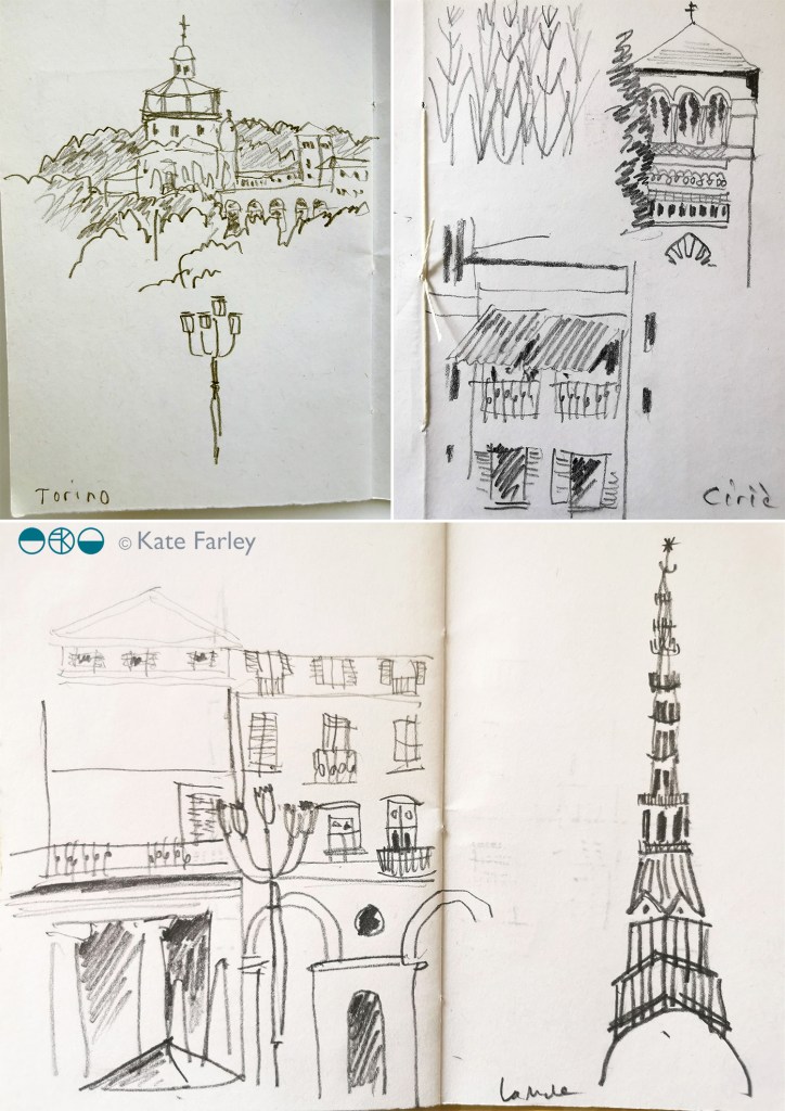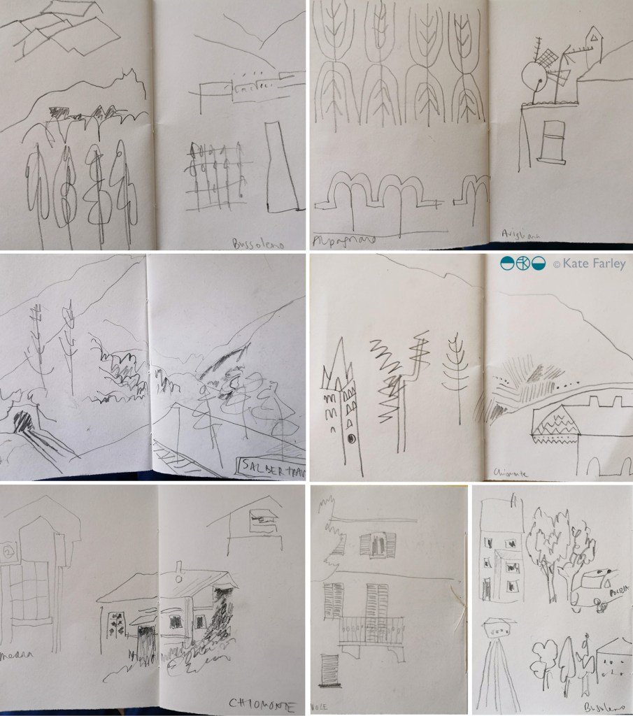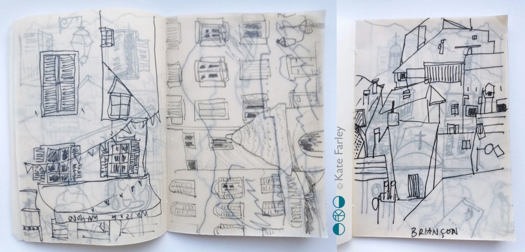 I’ve recently returned from a lovely family holiday, traveling by train from Norfolk to London and via Paris through France to the south and on in to Italy, up into the foothills of the Alps via Turin … and back again. I made lots of small sketchbooks so I could have one close at hand at all times, with a selection of pens and pencils. I’ve always enjoyed drawing from trains, preferably sitting backwards, looking, identifying shapes and details, then hastily capturing what I saw in a few lines.