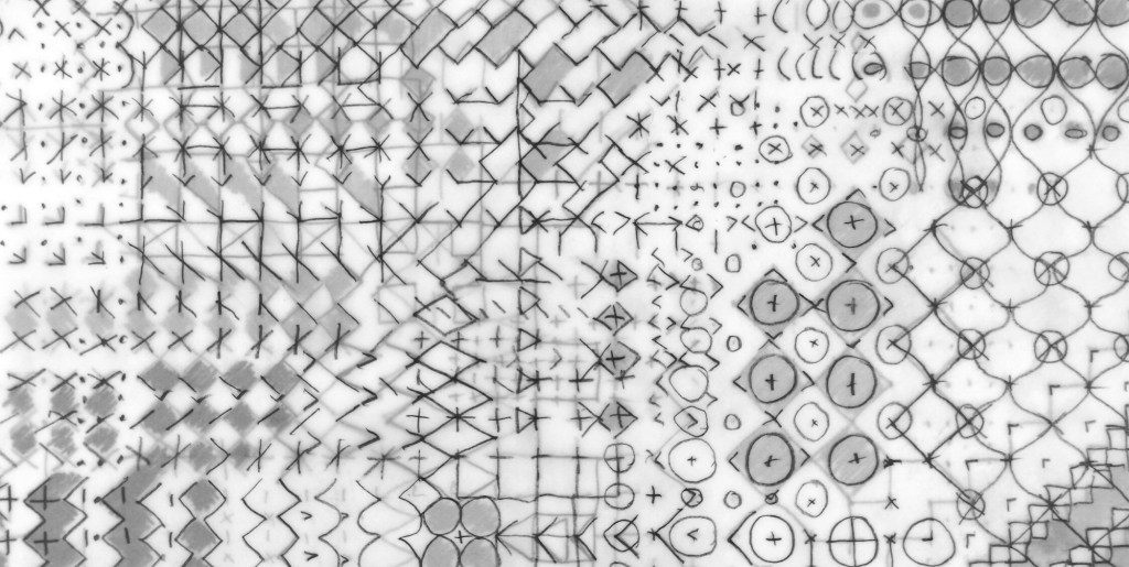 I’m not sure when I first became aware of Marthe’s patterns on wallpaper and cloth, but I’ve used her designs in my university lectures for the last few years to illustrate economic principles of building pattern, using a single block (one colour) to provide flowing and complex patterns, featuring varieties of visual texture within motifs. I bought the book on her life / design career, The Making of Marthe Armitage (published in 2019 by Graphical House) and was impressed by the beautiful drawings that accompany and support the design work I was familiar with. It is a thoughtfully produced book, with some copies available with a hand printed wallpaper wrap cover.